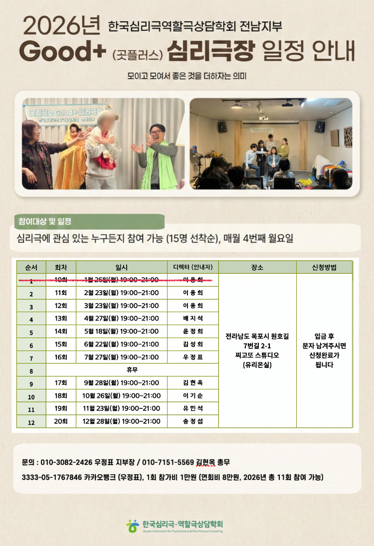 전남지부 | 2026년도 전남지부 굿플러스심리극장 계획일정표 페이지 정보 작성자 momtodac 작성일26-01-30 10:36 조회8회 댓글0건 관련링크 다음글 목록 본문 굿플러스 촬리입니다. 2026년도 가보쟈구요~ 댓글목록 등록된 댓글이 없습니다. 다음글 목록