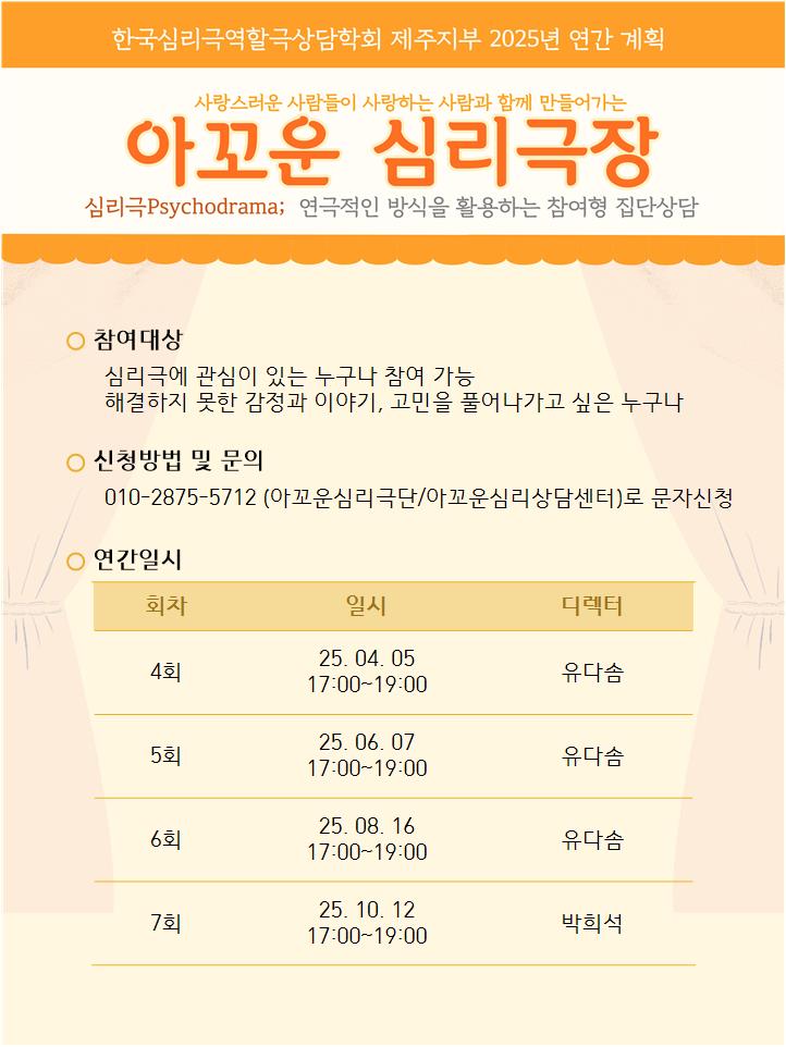 제주지부 | 2025년 아꼬운 심리극장 연간운영계획 페이지 정보 작성자 ektha16 작성일26-01-15 22:34 조회4회 댓글0건 관련링크 이전글 다음글 목록 본문 2025년 아꼬운 심리극장 연간운영계획입니다. 댓글목록 등록된 댓글이 없습니다. 이전글 다음글 목록