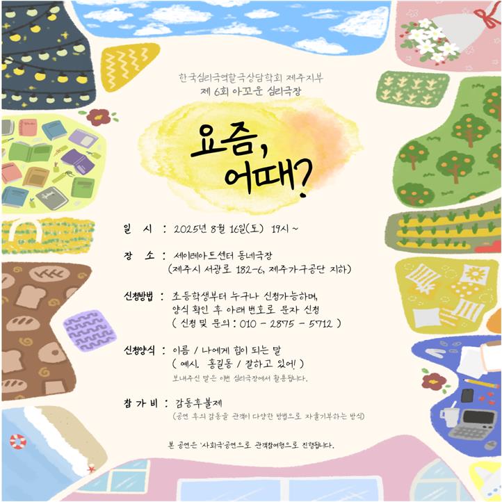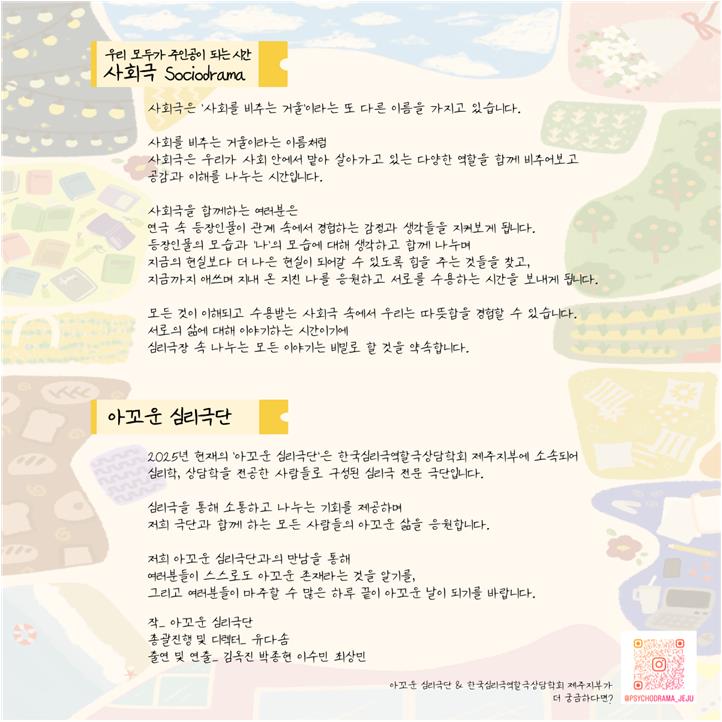 제주지부 | 2025년 6회 아꼬운심리극장 안내 페이지 정보 작성자 ektha16 작성일26-01-15 23:24 조회1회 댓글0건 관련링크 이전글 다음글 목록 본문 . 댓글목록 등록된 댓글이 없습니다. 이전글 다음글 목록