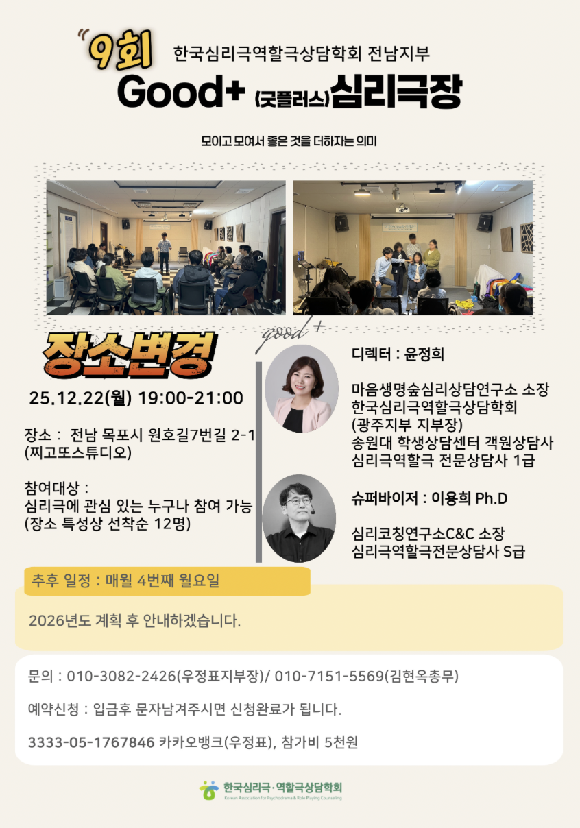 전남지부 | 제9회 25.12.22 Good+ (굿플러스)심리극장 계획 및 운영후기입니다 페이지 정보 작성자 momtodac 작성일26-01-16 00:19 조회1회 댓글0건 관련링크 다음글 목록 본문 제9회 25.12.22 Good+ (굿플러스)심리극장 계획 및 운영후기입니다윤정희 소장님께서 디렉팅해주셨습니다. 12월 마지막 디렉팅장소가 변경이 되어 새롭게 진행되었답니다. 댓글목록 등록된 댓글이 없습니다. 다음글 목록