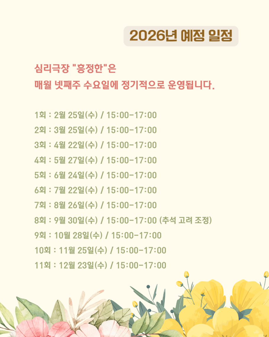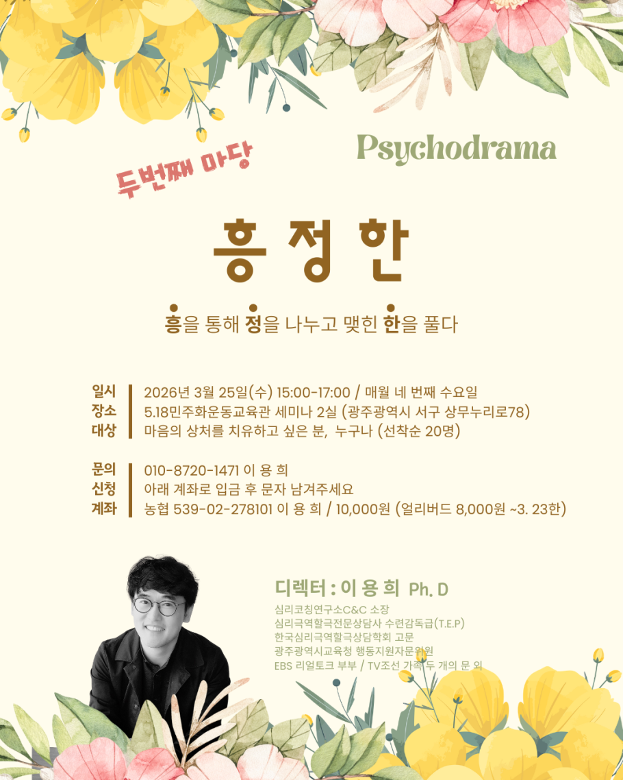 광주지부 | 심리극장, 흥정한 2회 안내 페이지 정보 작성자 corecept 작성일26-03-17 12:23 조회9회 댓글0건 관련링크 다음글 목록 본문 흥을 통해 정을 나누고 맺힌 한을 풀다심리극장, 흥정한두번째 마당을 안내합니다. 댓글목록 등록된 댓글이 없습니다. 다음글 목록
